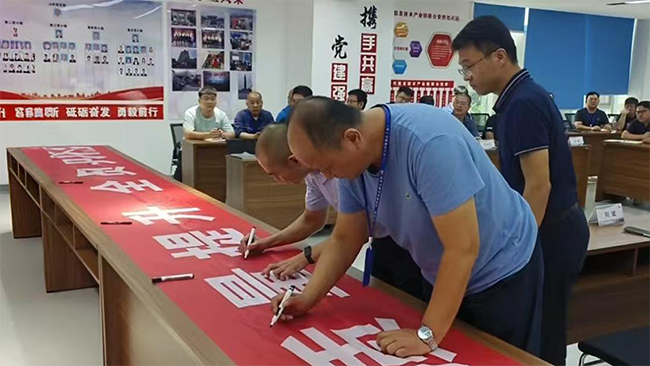 质量部经理赵而敬对本次“质量月”活动方案进行了全面细致的宣导。本次活动形式多样、内容扎实、奖励丰厚,设立了多项团队与个人奖项,旨在通过激励机制充分调动全员参与质量管理的积极性。在领誓人的带领下,全体参会人员起立,进行了庄严的质量宣誓。铿锵誓言回荡会场,展现了全体员工对质量追求的坚定信念和庄严承诺。宣誓完毕后,刘斌率先垂范,与参会员工纷纷在“质量提升,全员共进”主题横幅上郑重签名。一笔一划,书写的是对质量的承诺;一举一动,彰显的是对责任的担当。